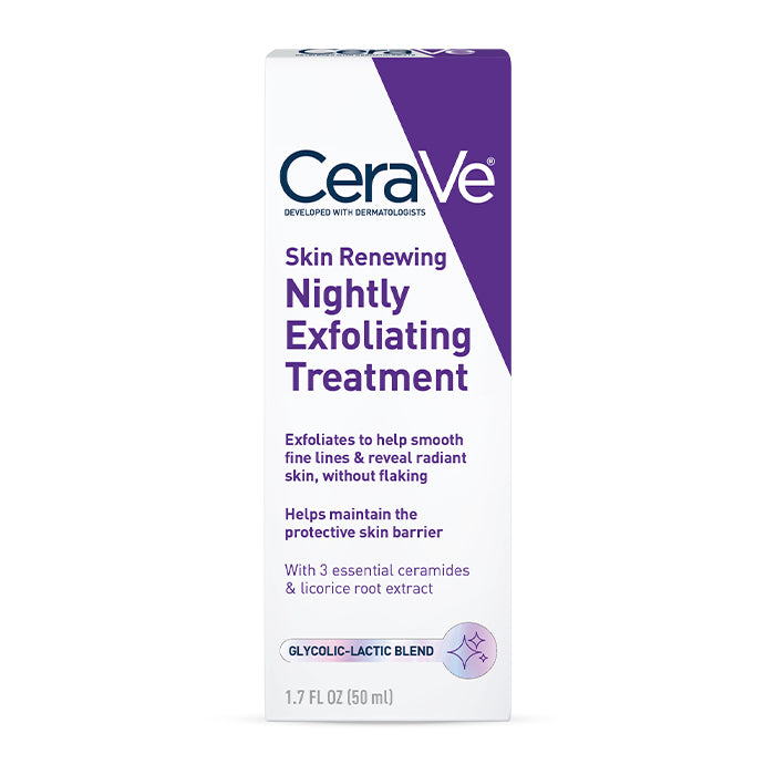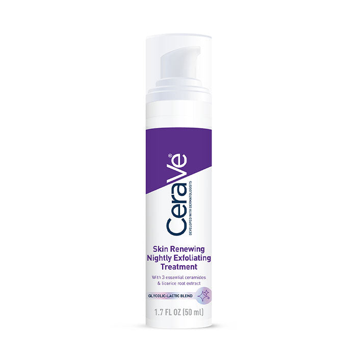 Developed with dermatologists, CeraVe Skin Renewing Nightly Exfoliating Treatment is an AHA serum with a 5% blend of glycolic acid and lactic acid for gentle exfoliation to help smooth fine lines, accelerate skin's surface cell renewal and clear away dead skin cells, without causing flaking or redness.