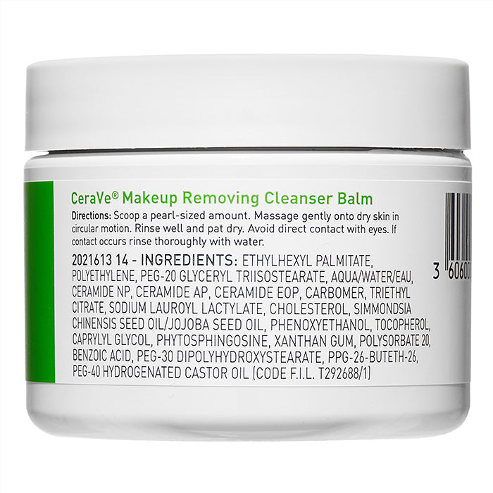 CeraVe Makeup Removing Cleanser Balm features a velvety melting balm texture that works to effectively dissolve longwear makeup and foundation, with no greasy residue left on the skin.