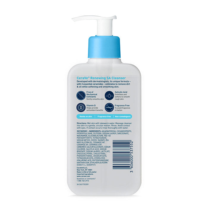 CeraVe Renewing SA Cleanser provides gentle, non-irritating exfoliation without harsh microbeads that can scratch your skin. Our salicylic acid cleanser not only exfoliates the skin, but with three essential ceramides, hyaluronic acid and niacinamide it also helps soften and smooth the skin without disrupting its protective barrier