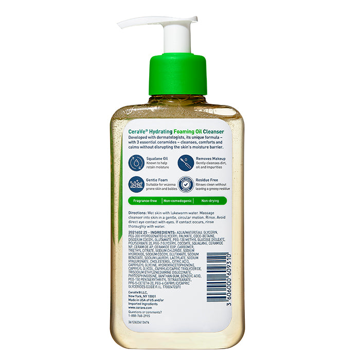 CeraVe Hydrating Foaming Oil Cleanser is formulated with three essential ceramides and squalane to lock in moisture and helps maintain the skin’s protective barrier, a feature especially beneficial to dry to very dry skin.